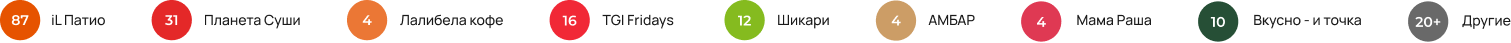 В портфеле «Росинтера» представлены собственные бренды, среди которых известные и любимые миллионами гостей «IL Патио», «Планета суши», «Шикари» , а также лицензионные, которыми компания управляет по системе франчайзинга — TGI FRIDAYS, «Вкусно – и точка». В 2024 году компания начала продажу франшизы сети городских кофеен Лалибела кофе.